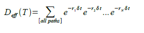 Now, it is tempting to think that when you go through the details of calculating this average, summing up the contributions for all possible paths, and dividing by the number of paths, you will find some kind of simple result in which Deff(T) will be equal to a single exponential factor with an average discount rate for the N years, ravg. In others words, you might think -- and most peoples' intuition would tend this way -- that you would find an equation such as
